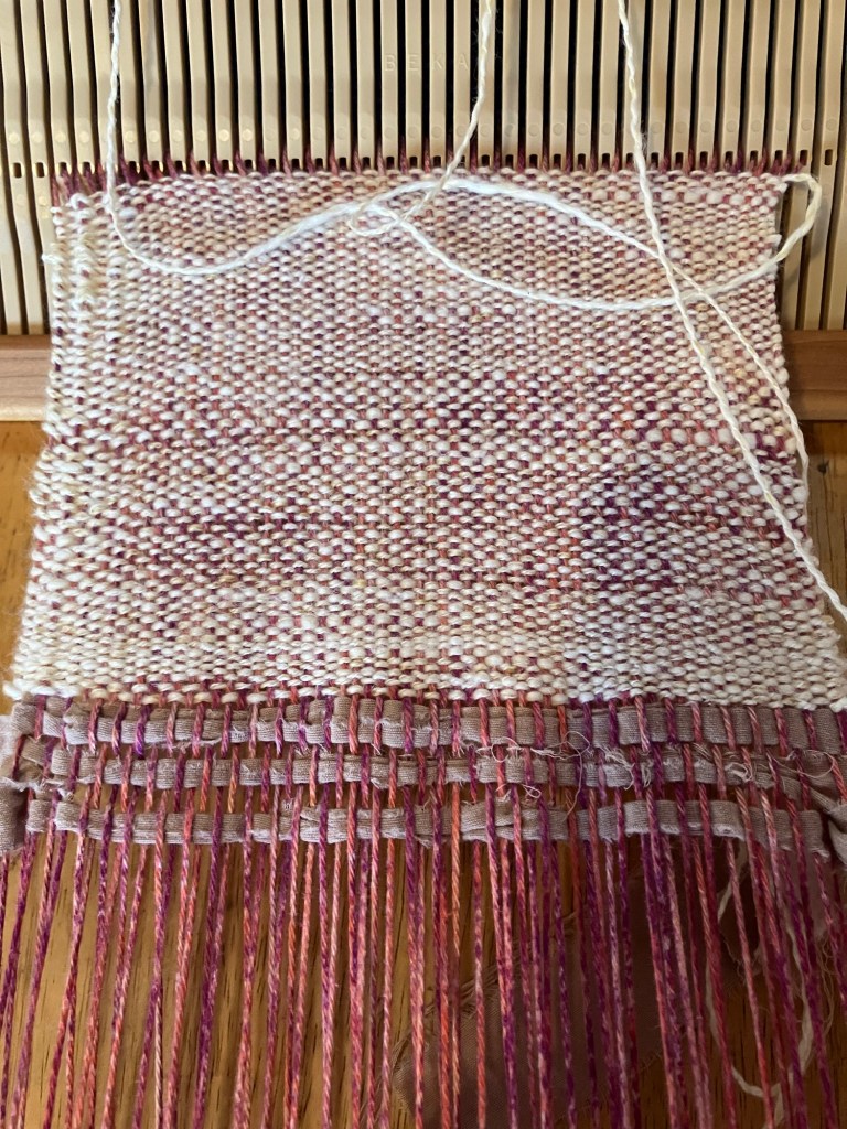 I originally started with purple. Then I thought it was too dark and switched to white. Then I realized I wanted a thicker white so I could see more of the warp, but I didn’t want to put the two whites right next to each other, so I put the purple down next.